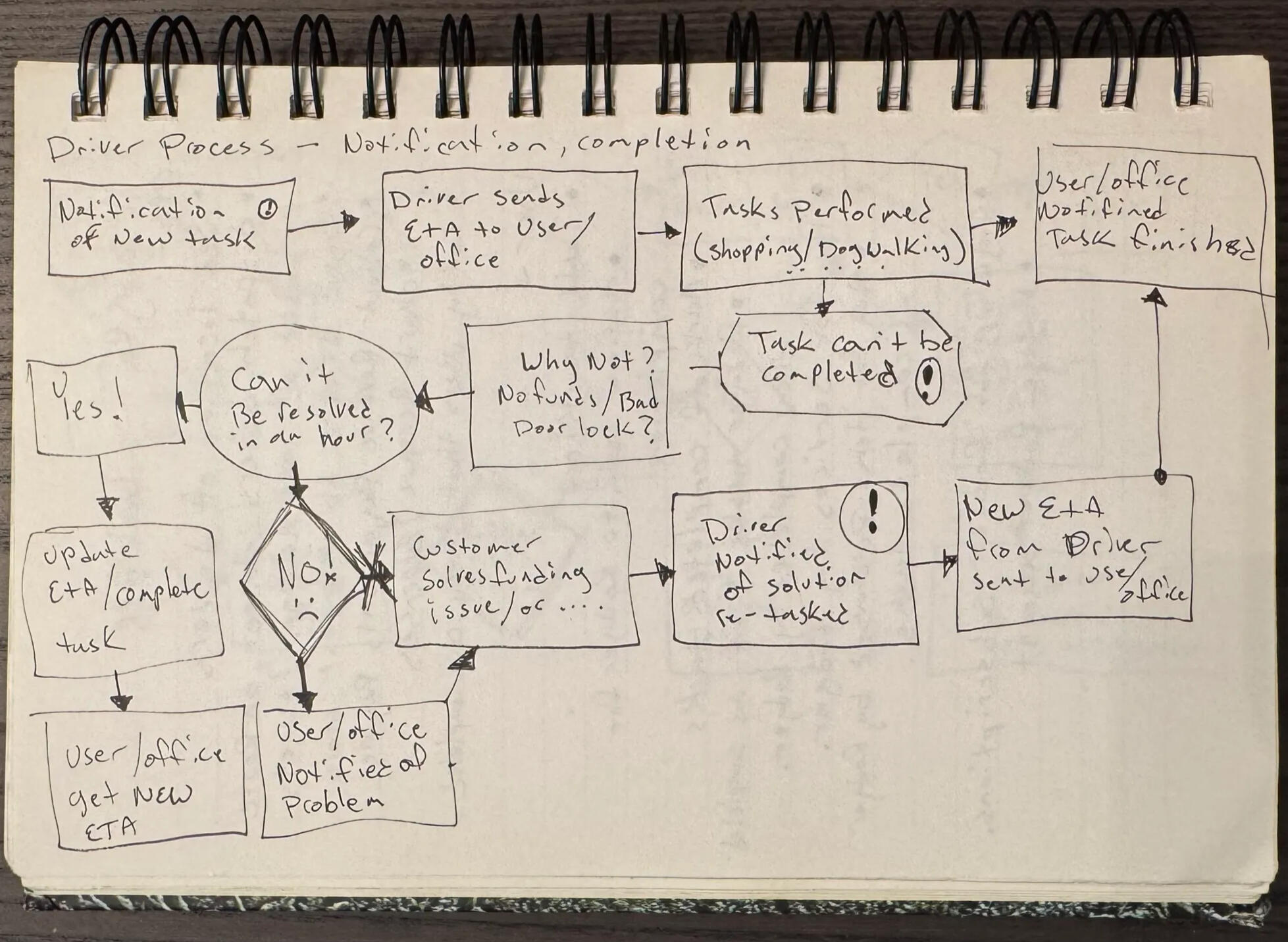 • Early flowcharts for driver notifications and task resolution routing